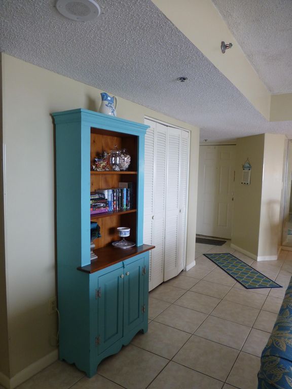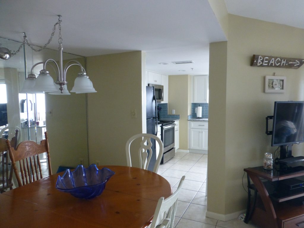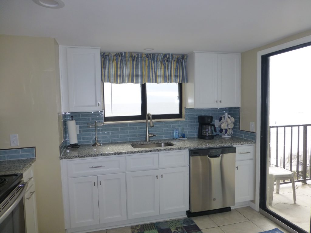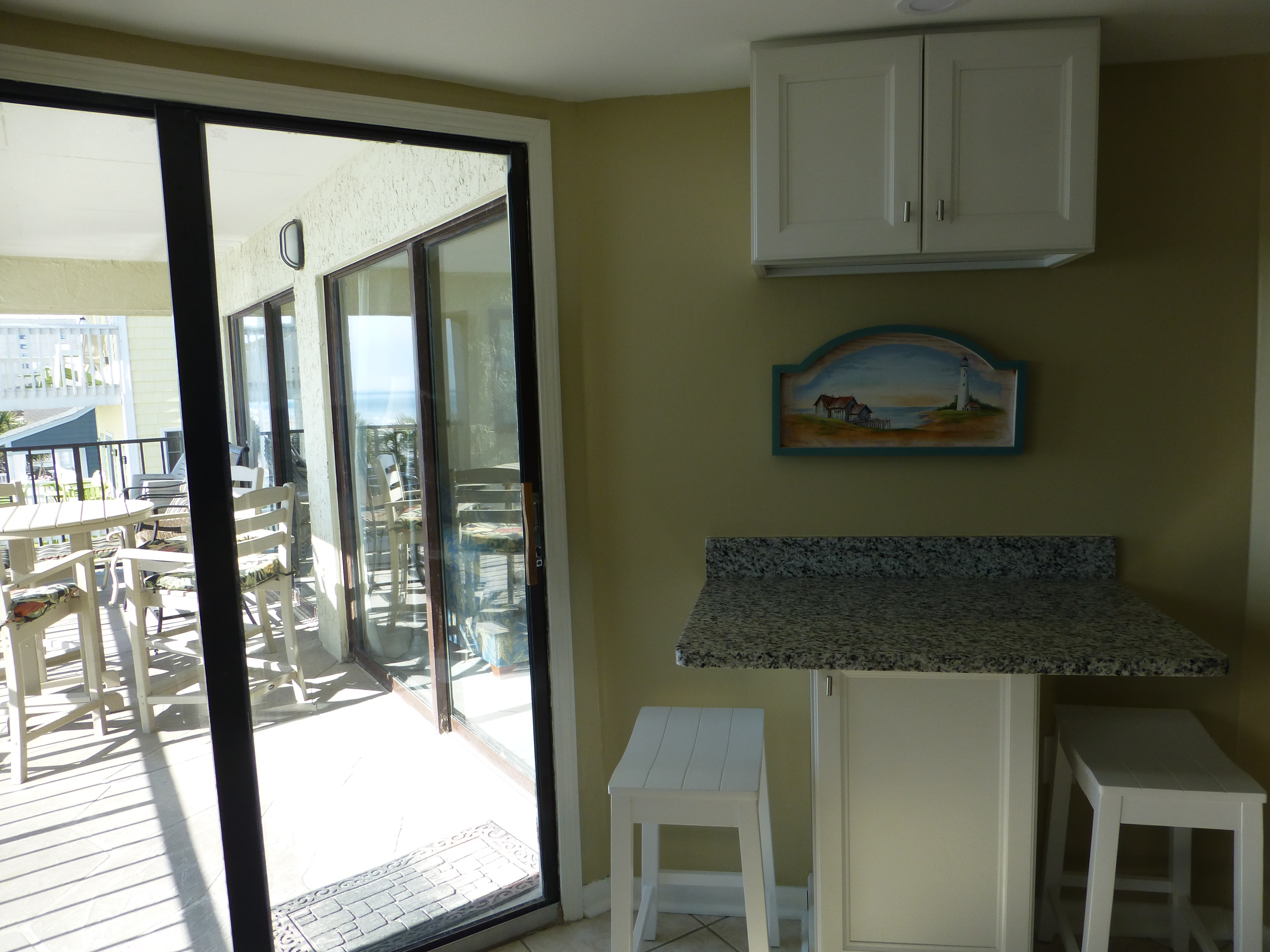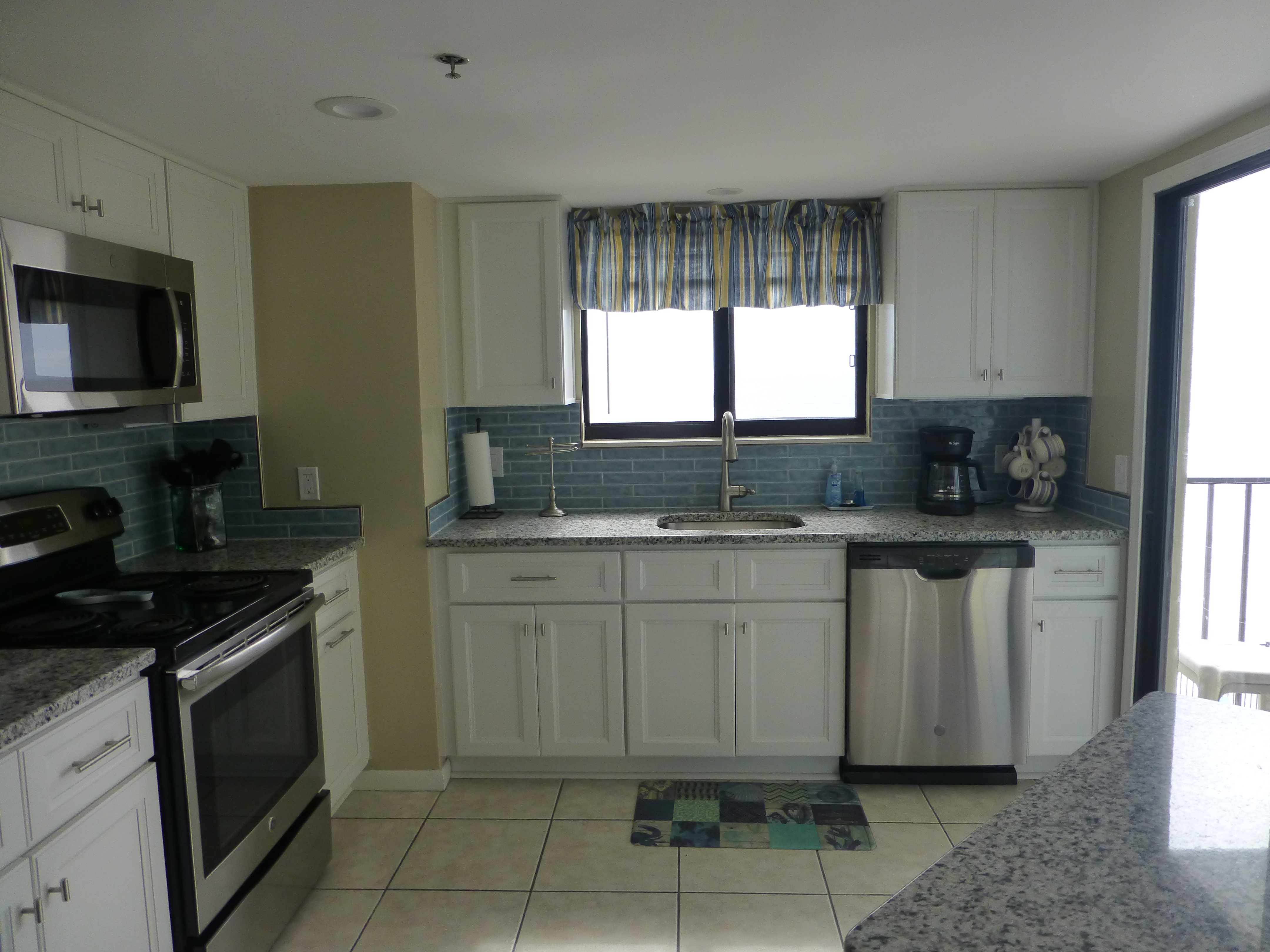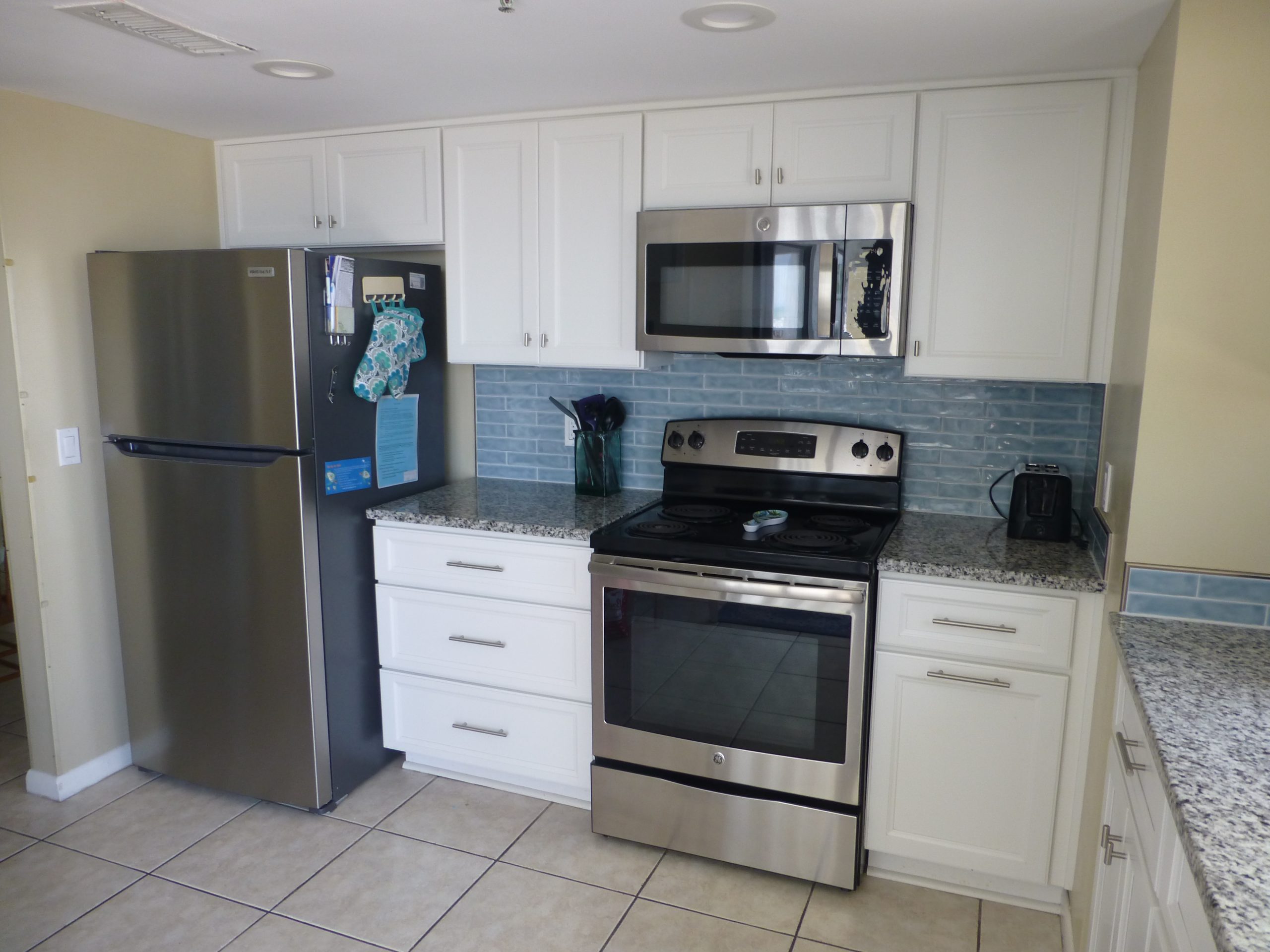 Kitchen remodeled in 2020. Ocean views from window over the sink and sliding door to balcony. Well equipped including; blender, toaster, coffee maker, crockpot. Ample supply of dishes, glassware, flatware, and cooking utensils. Counter height bar area with 2 stools for casual eating.