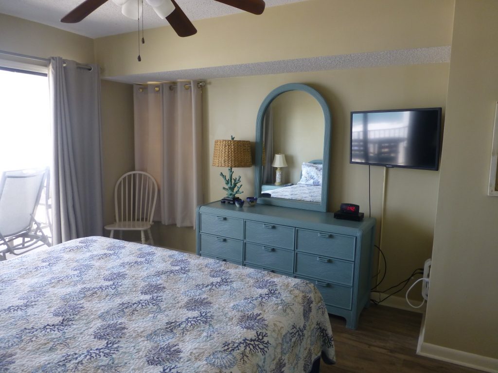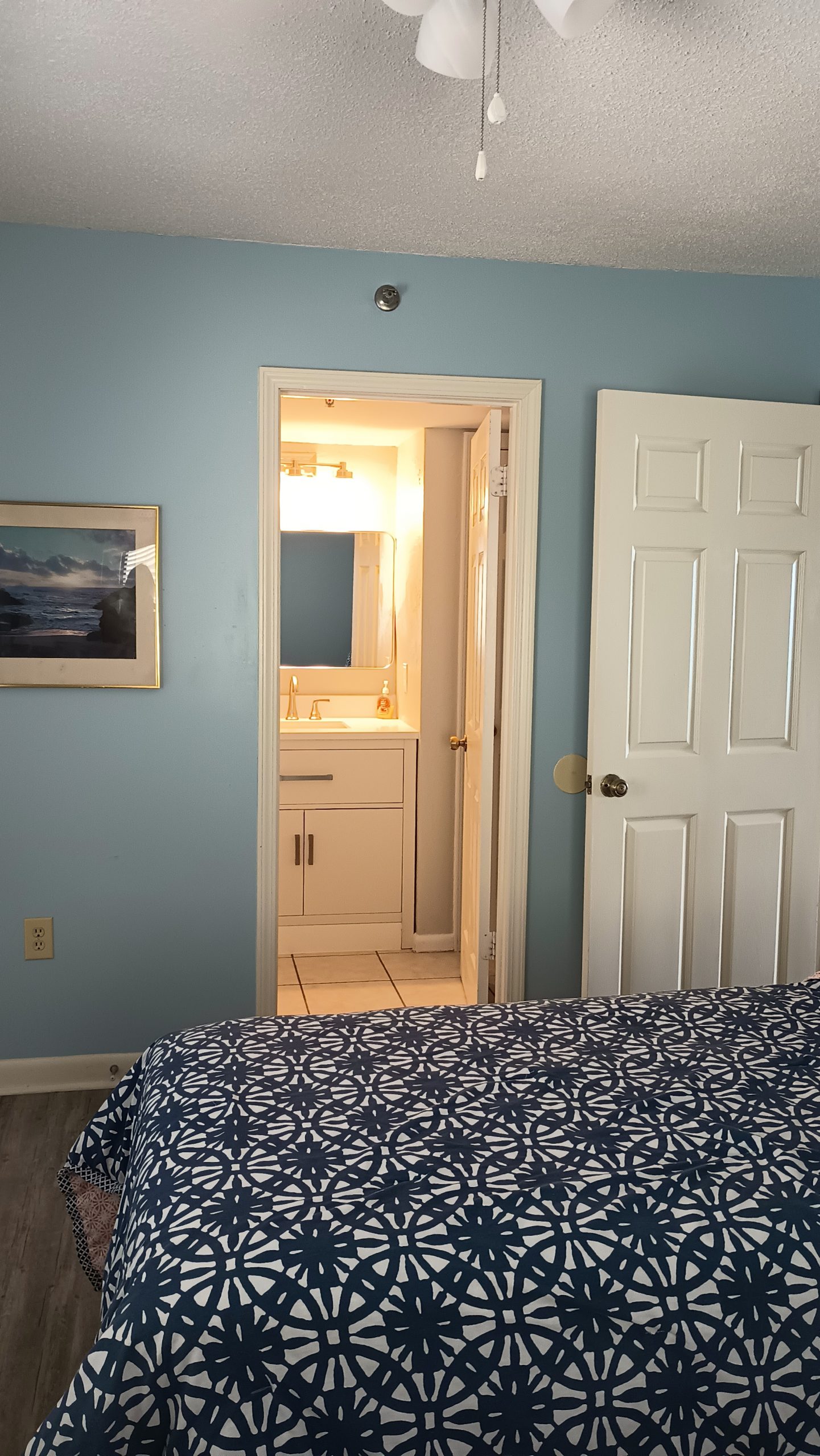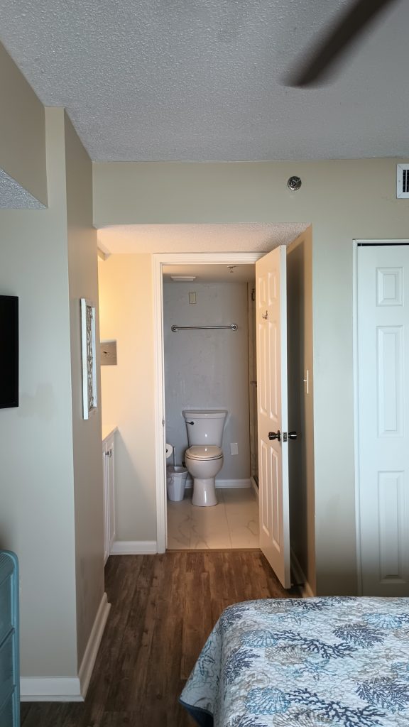 Primary bedroom has attached bathroom with shower. Newly remodeled in 2025. King size bed and 32″ flat screen TV. Large sliding glass door to oceanfront balcony. Ceiling fan. Wood look Vinyl plank flooring.
