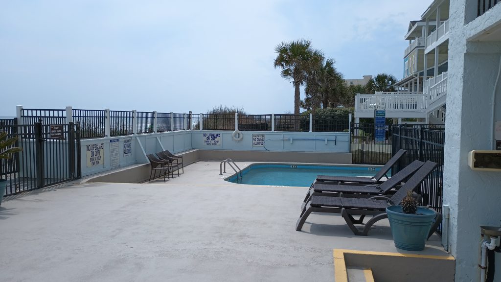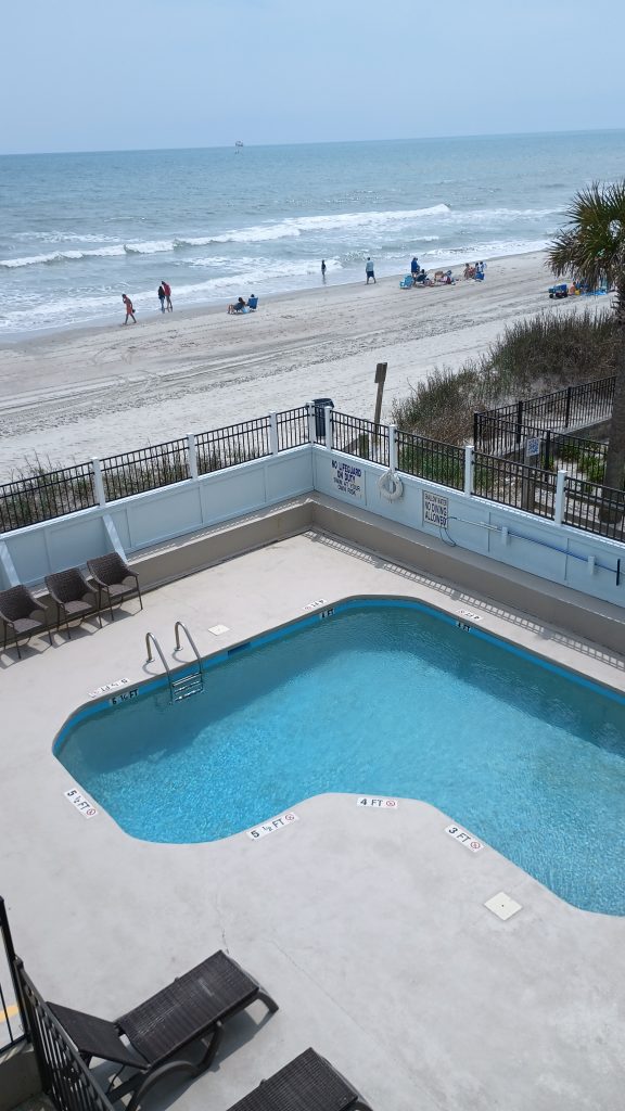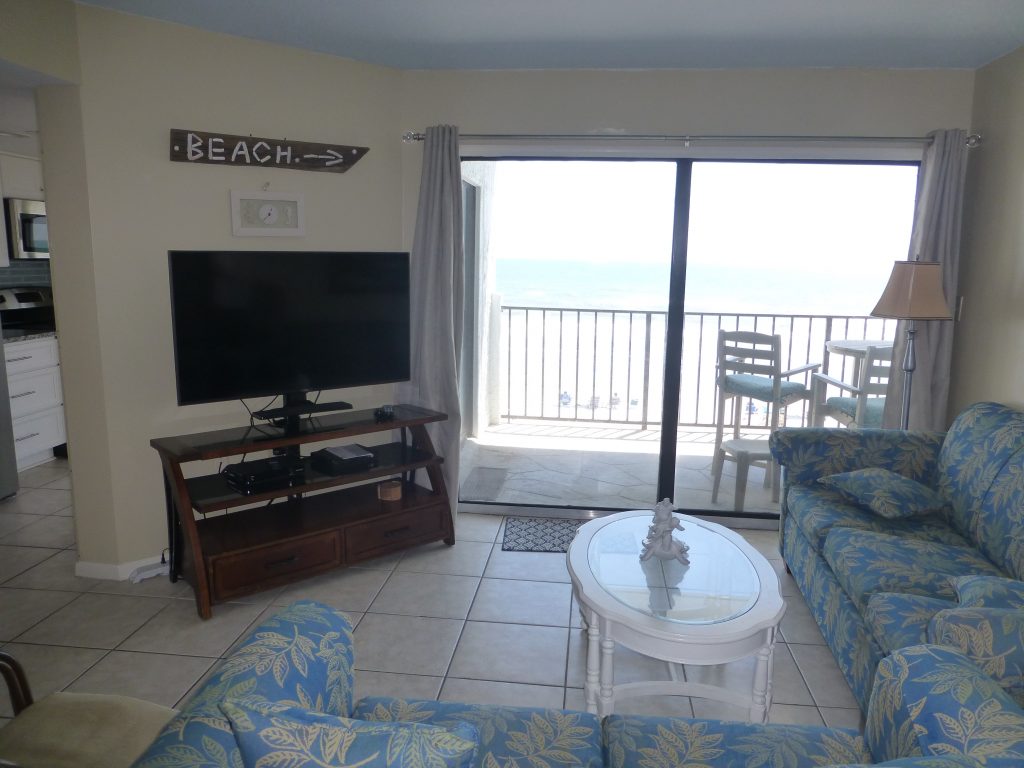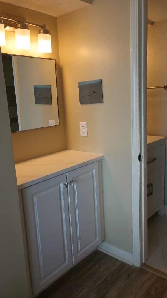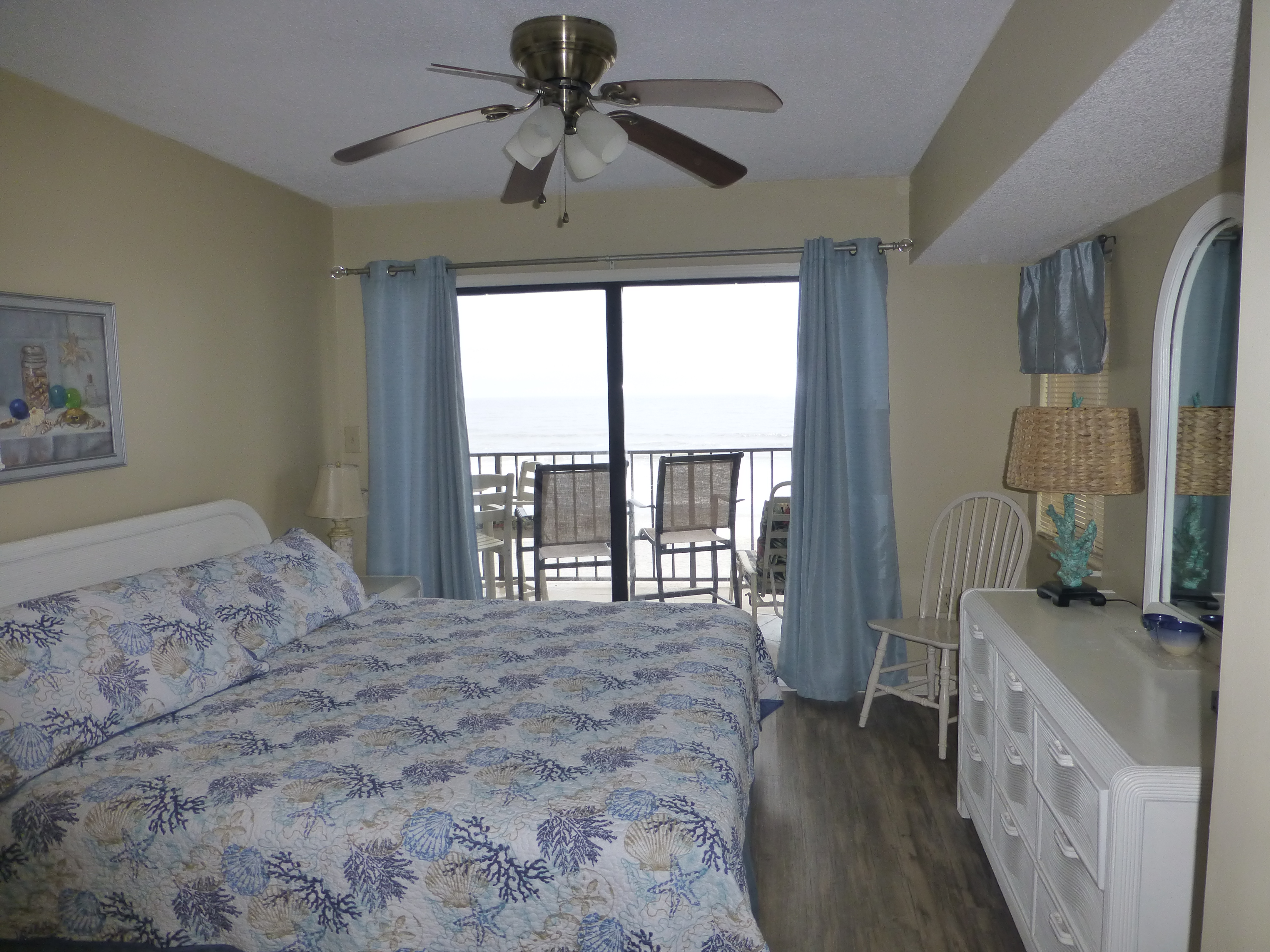 Primary bedroom has attached bathroom with shower. Newly remodeled in 2025. King size bed and 32″ flat screen TV. Large sliding glass door to oceanfront balcony. Ceiling fan. Wood look Vinyl plank flooring.